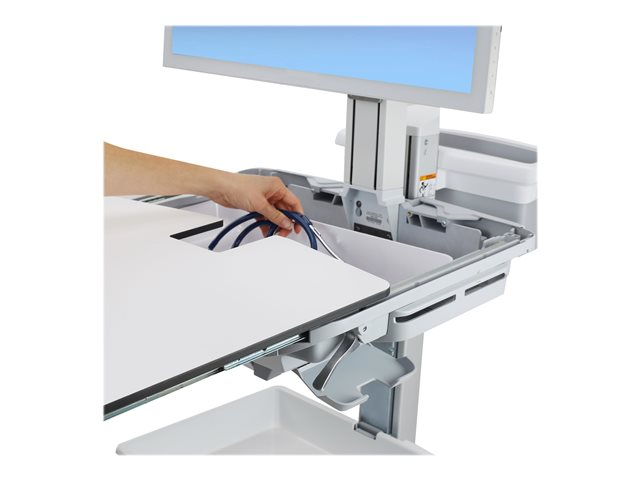 - Features a sliding worksurface that locks at 12 cm, providing a comfortable working distance from the monitor