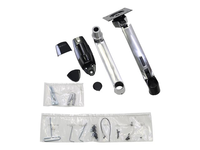 - Arm folds back over the base into a compact retracted position; perfect for tucking under systems furniture storage shelves or cabinets in space constrained areas
