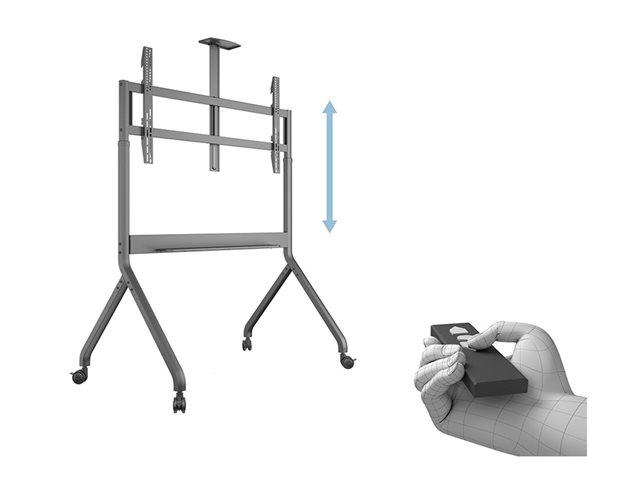 The motorized height adjustment is quiet and precise, controlled either by a panel-mounted button or a handheld RF remote, allowing effortless transitions between sitting and standing presentations. This floorstand is compatible with a broad range of interactive displays from brands like Samsung, LG, Philips, Hisense, Yealink, and more.
