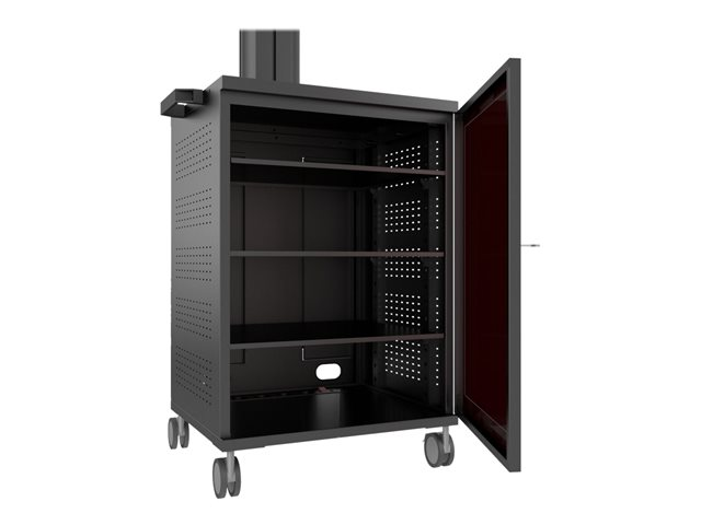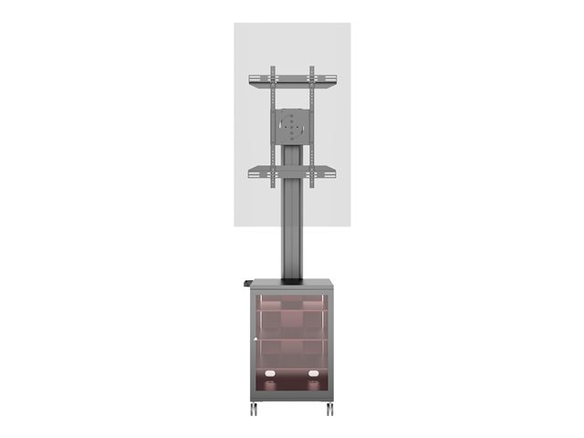 M Multibrackets Public Display Stand can be used with screens in a standard landscape mode or a portrait mode. The massive Mediabox4 stores all needed equipment.