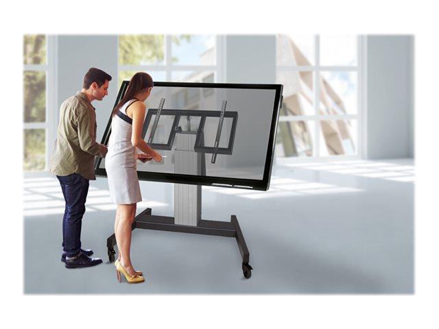 With the Neomounts by Newstar PLASMA-M2500TSILVER automatic height adjustable floor stand you place a large format flat screen on the floor. Get optimal positioning for both standing and seated audiences, in any application, in any part of your location. Perfect to use in a class room, boardroom, presentation room or public entrance. The PLASMA-M2500TSILVER has a 90 degree tilt function with allows the (touch)screen to be used in table-top mode. The stand is suited for screens between 42" - 100" and has a load capacity of 150 kg. The trolley is suitable for screens with a VESA hole pattern of 400x200 to 800x600 mm. Cables can be guided at the back of the mount. Easily roll this cart over doorways and thresholds with to the high quality wheels. The mobile electric floor lift is automatically height adjustable over a height of 50 cm with a remote control. From the floor to the center the distance of the screen is variable from 89 cm to 139 cm (vertical) and from 95 cm to 145 cm (horizontal). The Neomounts by Newstar PLASMA-M2500TSILVER comes in a silver/white aluminium RAL 9006 color and is a great choice for space saving placement or when wall-, ceiling mounting or desk placement is not an option. All installation material is included with the product.