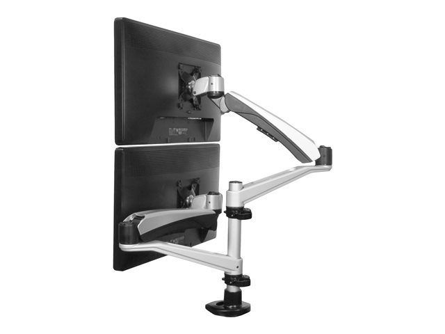 Den dubbla skärmmonteringen stöder två skärmar från 12" till 24" om de är staplade. En vertikal konfiguration gör jämförelser enklare i många situationer, inklusive finansiell analys, webbdesign, granskning av kalkylblad och många andra. Observera: För att kunna stapla två skärmar på 24" får inte höjden på varje skärm (inklusive ramen runt skärmytan) överstiga 35 cm.