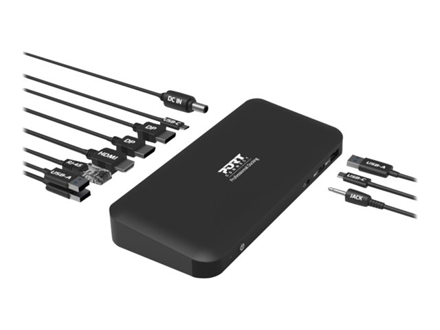 The USB-C 3X4K Office Docking Station by PORT Connect increases laptop connectivity and provides up to 85W of Power Distribution. This device supports up to 9 peripherals simultaneously. It offers two options for displaying additional screens using DisplayPort 's Multi-Stream Transport technology: 2 additional screens up to 4K or 3 additional screens up to 4K (without a laptop screen). Its 3 USB-A ports allow high-speed data transfer (up to 5Gb/s.), and its USB-C port enables charging devices and data transfer up to 10Gb/s. Equipped with an ON/OFF button and smart power management, power consumption is optimized during use. In addition, this model ensures high security in a business environment with its PXE boot and Wake On LAN functions and built-in security slot. This docking station is compatible with PCs, Mac and Chromebook via USB-C.