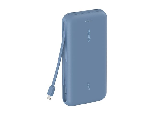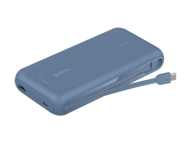 med integrerad kabel - 20000 mAh - 30 Watt - PD - 3 utdatakontakter (2 x USB-C, USB) - blå