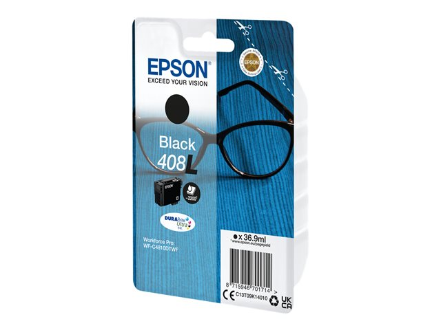 Epsons DURABrite Ultra-bläck i 408-serien är det bästa alternativet för att skapa dokument med professionellt utseende som tål vatten, smuts och överstrykningspennor. Det finns prisvärda bläckpatroner i både standard- och L-storlek för alla typer av användare. Du kan hitta det enkelt i butiken och online genom att söka efter bilden på ett par glasögon.