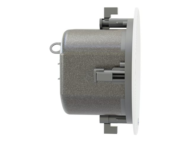 The flush-mounting speakers can be installed in the ceiling or wall and come with a lightweight ceiling tile brace. The air-sealed steel enclosure features a recessed cable cavity and a removable phoenix-style plug. Removing the magnetic, neutral white metal grille reveals convenient baffle-located screws to secure the swivel-out mounting tabs.