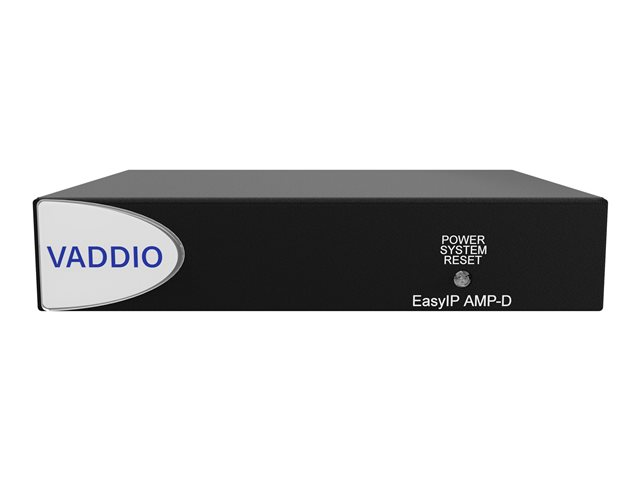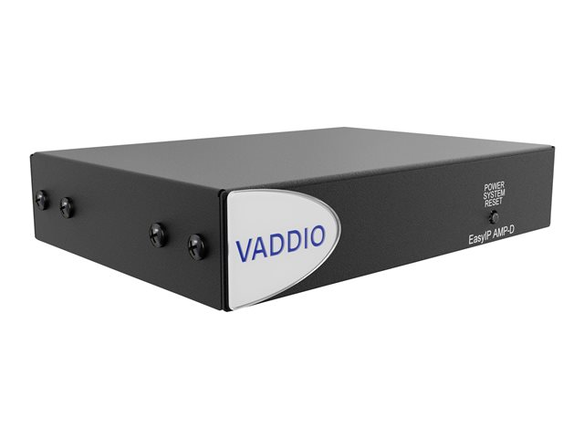The EasyIP AMP D features one PoE+ network connection and one powered stereo speaker output making it the ideal solution for incorporating a passive speaker with an EasyIP or Dante audio system. By providing digital signal transmission over the network, Dante makes installing any size project easy. The EasyIP AMP D is part of the expanding family of Vaddio's EasyIP AV-over-IP ecosystem.