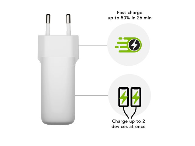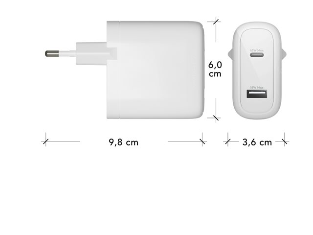 Strömadapter - 65 Watt - 2 utdatakontakter (24 pin USB-C, USB) - vit - Europa