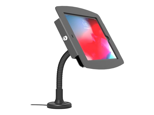 Limited cable management is available through the mount and arm of the stand (suitable for Lightning cable or up to 10 mm cable extensions). The Space iPad Flex arm is fixed with screws and there is also an option for an adhesive base add-on, for a screw-free installation.