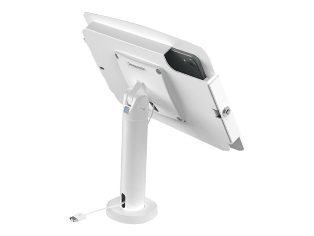 The Space iPad Enclosure features rounded edges and open corners for improved ventilation and allows for limited access to buttons and inputs. Included is a removable home button cover to restrict access to the main button. As with all iPad lock and tablet lock devices, the tablet can be continuously charged while in the enclosure and have peripheral cables plugged in while mounted.