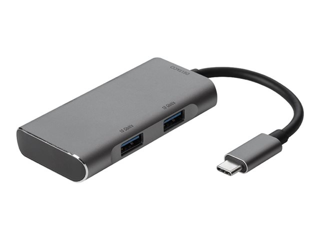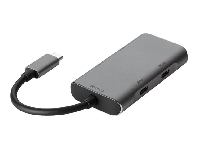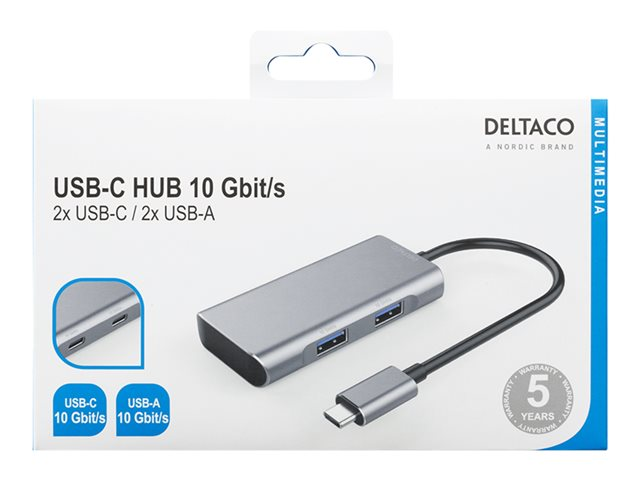 DELTACOS USB-C hubb är utformad för att ansluta två USB-C och två USB-A-enheter samtidigt. Båda USB-C-portarna och båda USB-A-portarna kan används för överföring av data upp till 10 Gb/s och laddning för de anslutna enheterna t.ex. mobiltelefoner, surfplattor eller externa hårddiskar.