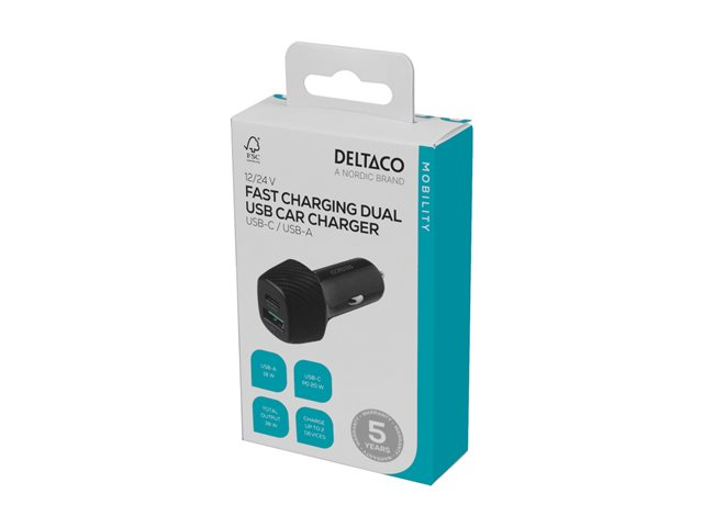 USB car charger 1x USB-C PD 20 W, 1x USB-A 18 W, total 38 W