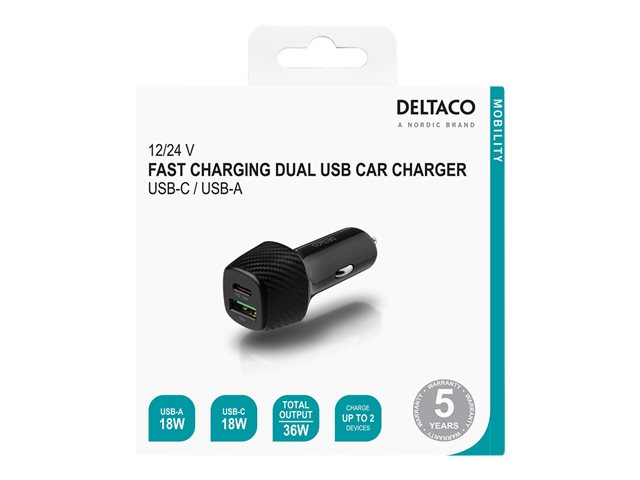 12/24 V billadare med snabbladdning och dubbla USB-portar (USB-A & USB-C) för bekväm snabbladdning av upp till två enheter samtidigt. Laddaren är utrustad med ett flertal säkerhetsfunktioner som förhindrar elektronisk skada.