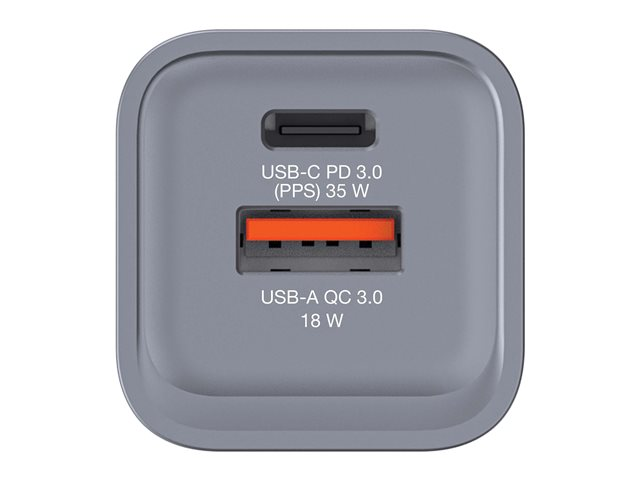 Verbatim's 35W GaN Wall Charger combines one USB-C PD port and one USB-A QC 3.0 port in a sleek, palm sized design. Ideal for the office, home or traveling, this charger powers your tablet, smartphone, gaming devices, and more. With its foldable US prongs and replaceable EU and UK plugs, it's the ultimate travel companion. Gallium Nitride (GaN) technology delivers high-powered, fast, efficient charging, generates less heat and allows for smaller and lighter chargers, making them ultra-portable. The GNC-35 charger is made with high-quality, flame-resistant materials and features four safety protection systems to ensure your safety while charging.