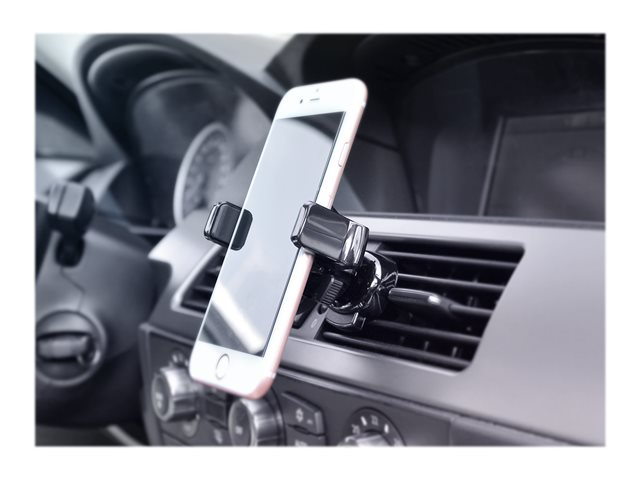 Denna universella hållare sätter du enkelt fast i ett ventilationsgaller i din bil. När hållaren ska användas trycker du din smartphone mot hållaren som automatisk klämmer fast smartphonen tack vare en knapp på insidan av hållaren. Hållaren klämmer endast fast på sidorna vilket gör att du kan komma åt dina anslutningar för t.ex. laddning eller hörlursutgång både på ovansidan och undertill utan problem. Hållaren har en kulled som gör att du kan vinkla och rotera din smartphone som du vill ha den.
