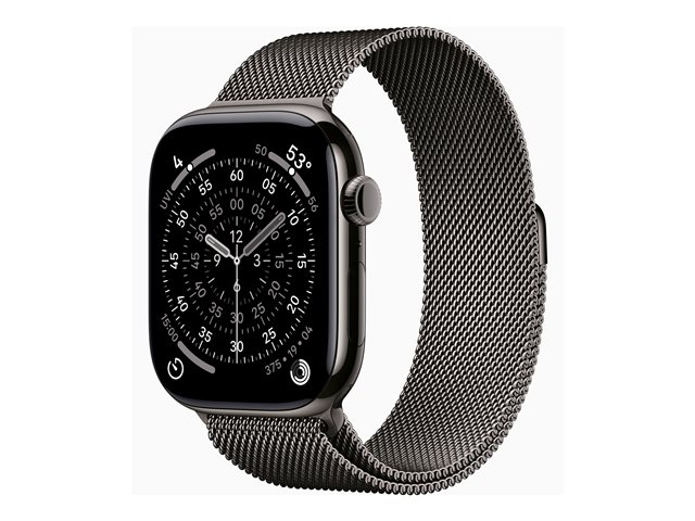 46 mm - skiffer titan - smart klocka med milanesisk loop - nät av rostfritt stål - skiffer - bandstorlek: S/M - 64 GB - Bluetooth, LTE, Wi-Fi 4, UWB - 5G - 43.1 g