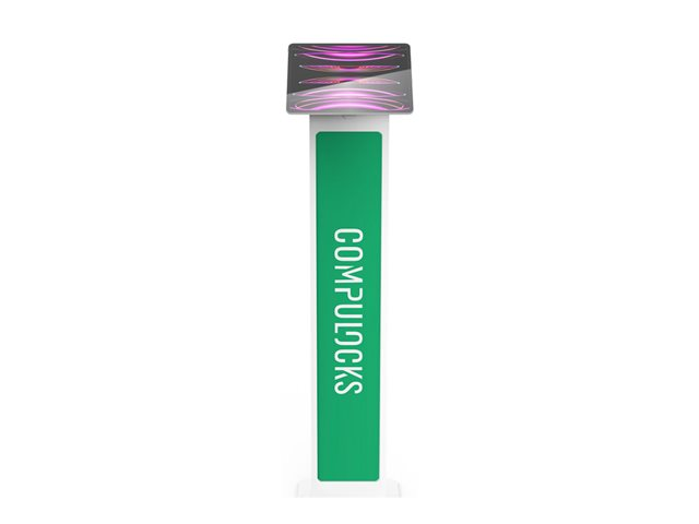 The BrandMe stand allows you to utilize a panel for branding, call to action or custom design to bring attention to your interactive display or kiosk. The tilting mount allows the iPad enclosure to be set in either portrait or landscape mode and the stand base offers additional security features, securing the power source and bolting the unit to the floor.