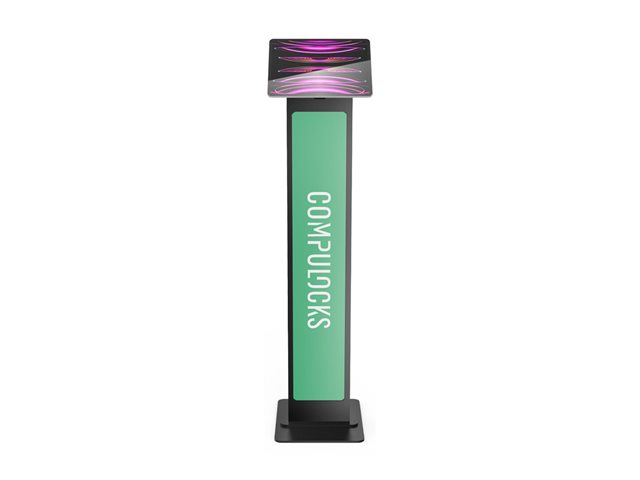 The BrandMe stand allows you to utilize a panel for branding, call to action or custom design to bring attention to your interactive display or kiosk. The tilting mount allows the iPad enclosure to be set in either portrait or landscape mode and the stand base offers additional security features, securing the power source and bolting the unit to the floor.