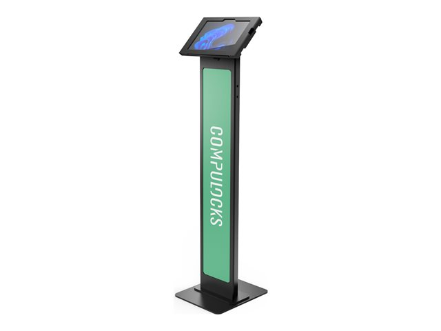 The Compulocks Surface GO 1-4 Gen Apex Enclosure Brandable Floor Stand in Black is a premium AV furniture solution designed to meet the needs of businesses and individuals alike. Constructed with a sturdy metal frame, this stand offers a secure and durable housing for tablets. It features a key lock system, ensuring your device remains safe and protected against unauthorized access. The stand's tilt adjustments allow for flexible viewing options, accommodating various presentation styles and interactive displays. Additionally, its floor-standing design provides stability and versatility in placement, making it suitable for a wide range of environments. The unique brandable feature of the Apex Enclosure enables businesses to customize the stand with their logo, enhancing brand visibility and creating a personalized touch. Whether for commercial use or personal enjoyment, this stand combines security, functionality, and customization, making it an excellent choice for securing and displaying tablets.
