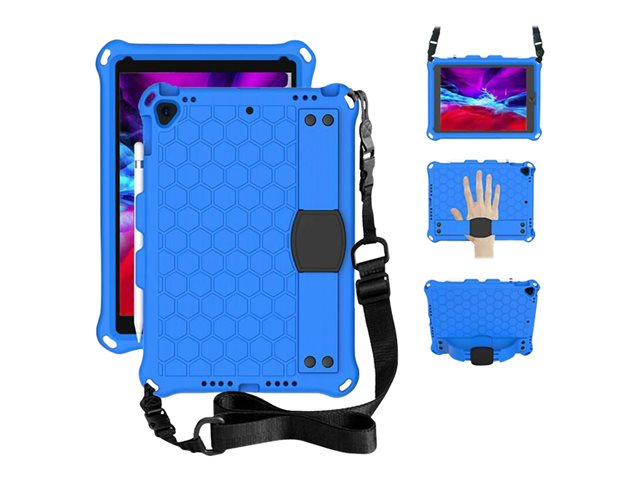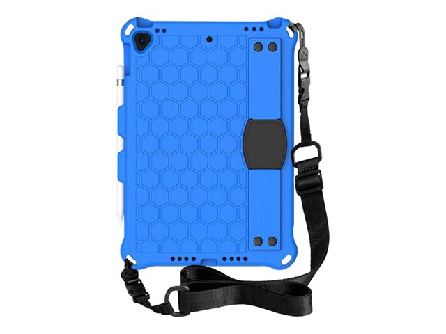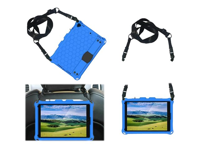 The non-toxic EVA case is shock proof and made for the daily stress a tablet is typically exposed to. The handle on the back of the case is cleverly designed for a better grip, but can also be used as a kick stand. A shoulder strap is included to make it easier to carry. The raised sides on both the front and around the camera, provides better drop protection. All buttons are protected, but can easily be operated. All ports are accessible The cover does not include a front glass.