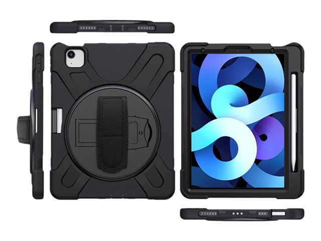 Shockproof cover designed for every day use. It is equipped with a pencil slot as well as a hand strap for a firm grip. Furthermore, it is delivered with a shoulder strap should you wish to carry the tablet in an easy way. The built-in 360degree rotatable kick stand makes it possible to use the tablet in both horizontal and vertical position. Built-in air cushion protection safeguards the tablet corners if the tablet is dropped. The raised sides on both the front and around the camera hole offers better drop protection for the camera and the front glass. All buttons are protected, but can easily be operated as well as there is easy access to all ports. The cover does not include a front glass. The cover is a three layer cover with a hard PC inner cover (2 parts) as well as a silicone skin.