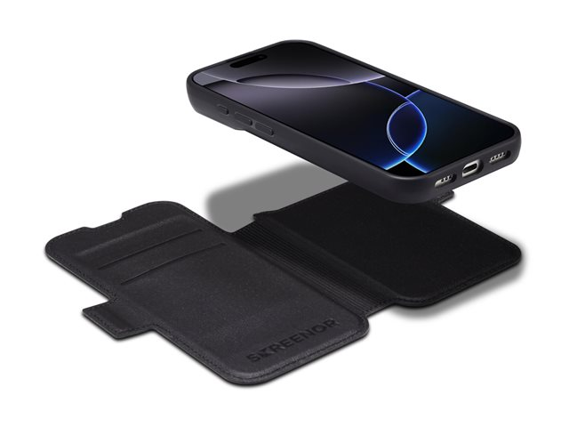 Screenor First 2-in-1 fodralet kan användas både som ett plånboksfodral och som ett skal. TPU bakskalet hålls fast i fodralen genom magnetisk fäste. Båda enheter stöder Apple MagSafe -tillbehör.