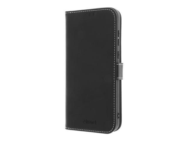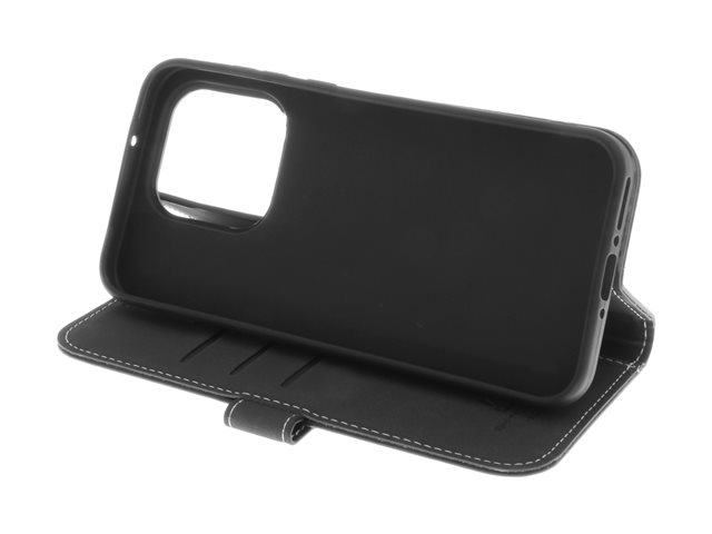 Vikbart fodral för mobiltelefon - genuint läder, kartong+papper, polykarbonat, bomullssömmar, 2 magneter, galvaniserad bronsring - svart - för OnePlus 15