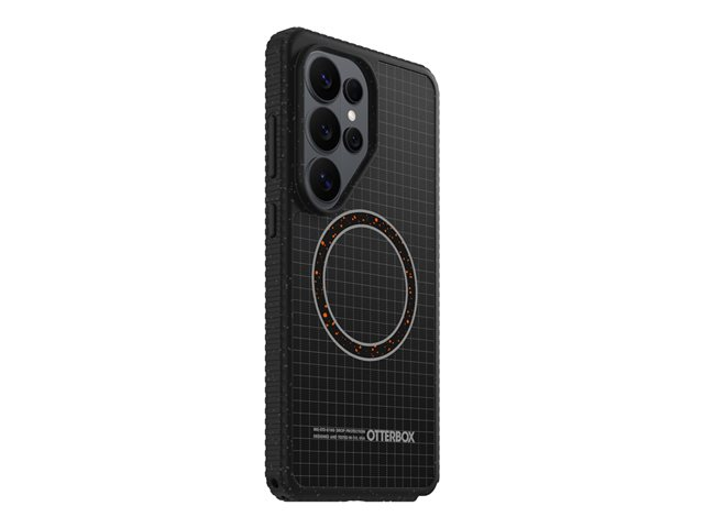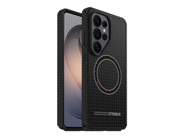 The OtterBox Sole Series carrying case provides robust protection for cell phones with its protective back cover design. Constructed from durable materials including nylon fabric, polycarbonate, and thermoplastic elastomer (TPE), this case is built to withstand the rigors of daily use. It features built-in magnets for added convenience and a lanyard loop for easy carrying. The case supports wireless charging and is designed with raised edges to safeguard your camera and screen against accidental drops, meeting Military Standard requirements for drop protection.