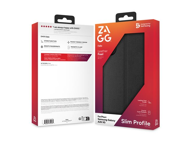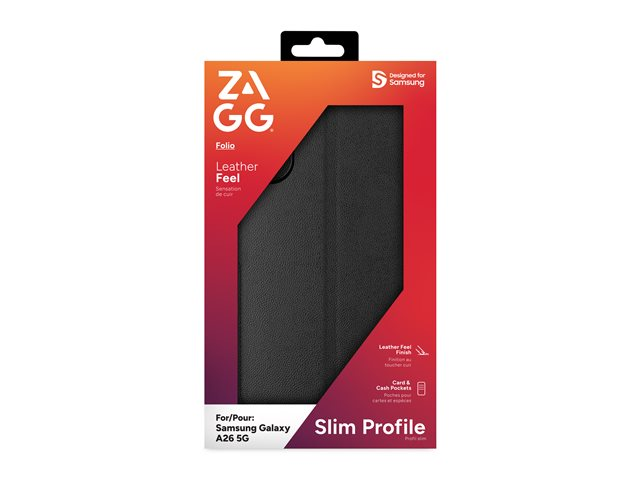 The ZAGG Folio Case for Samsung A26 combines elegance and functionality with its leather-feel finish and built-in card and cash pockets. Designed for convenience, it features a stand function for hands-free use and resists fingerprints to keep it looking pristine. The pocket-friendly design and magnetic clasp provide a secure, stylish way to protect your device while on the go.