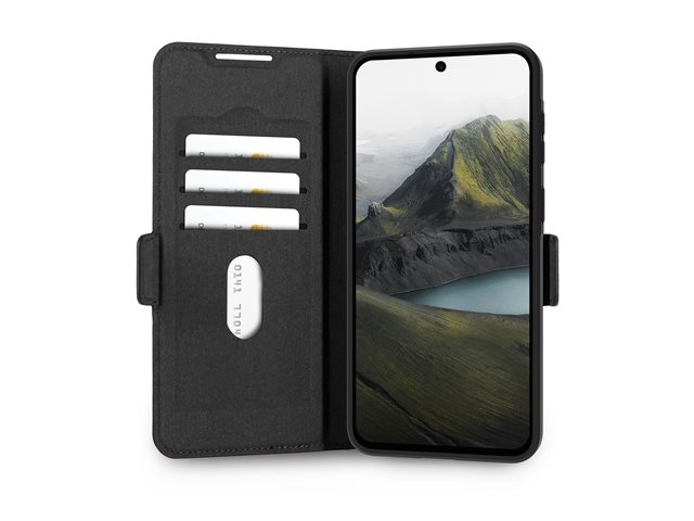 Oslo Pro is an impact protective folio wallet case made from recycled plastic with a finish meant to look and feel like leather. With its foldable back, you can enjoy hands-free horizontal video watching.