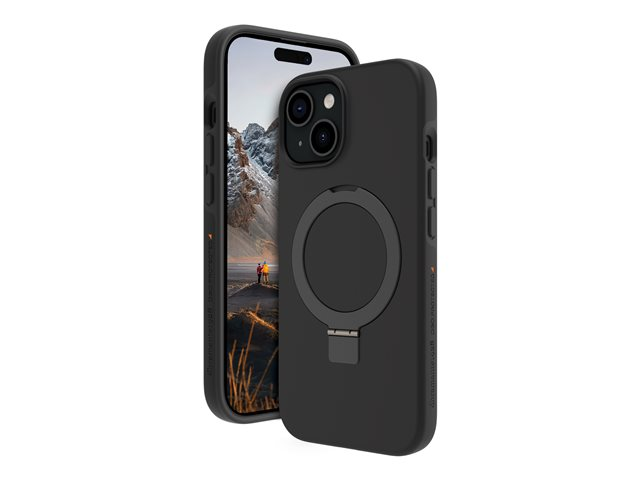 Baksidesskydd för mobiltelefon - med fällbart ställ - MagSafe-kompatibilitet - D3O, plast - svart - för Apple iPhone 13, 14, 15, 16e