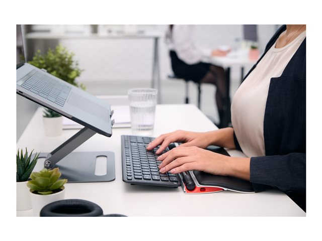 - Det breda handledsstödet av veganläder och memoryskum har en antibakteriell yta med hög tålighet mot desinfektioner för optimal hygien