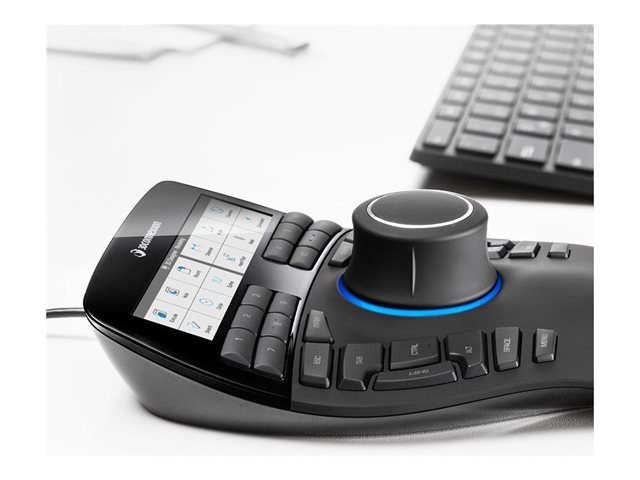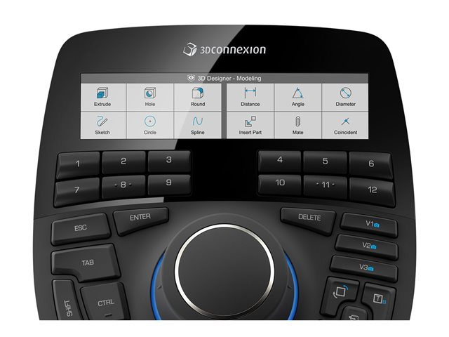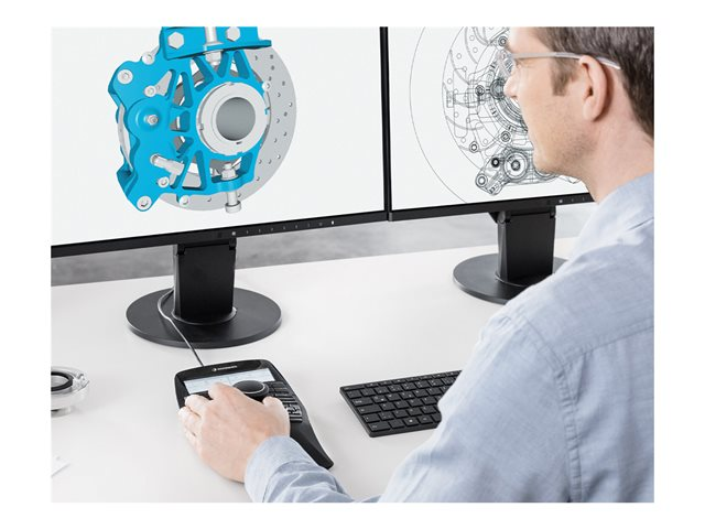 Med SpaceMouse Enterprise är det enkelt och dynamiskt att inte bara visa och förstå konstruktioner, utan även att redigera dem. En snabb blick är allt som krävs för att ha alla verktyg till hands. Detta beror på att den högupplösta LCD-färgdisplayen alltid visar den aktuella tilldelningen av de 12 intelligenta funktionsknapparna och använder de välbekanta ikonerna från den för närvarande aktiva CAD-applikationen eller miljön.