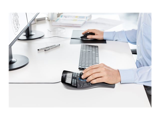 SpaceMouse Enterprise sätter också nya standarder när det gäller ergonomi och användarkomfort. Den avancerade designen förebygger belastningsskador - till exempel med det ergonomiskt optimerade handstödet och för första gången en komplett uppsättning tangentbordsomkopplare, vilket avsevärt minskar behovet av att sträcka sig efter tangentbordet med båda händerna.