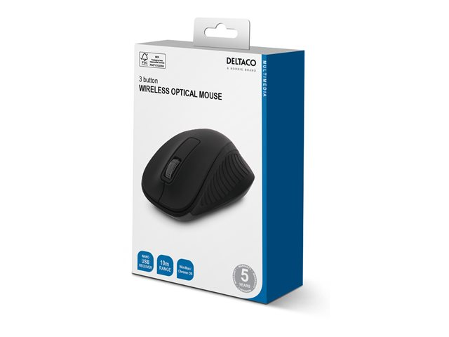 Trådlös optisk mus, 1200 DPI, 125 Hz, 3 knappar med scroll, 2. 4GHz USB nano-mottagare, svart. Trådlös mus med optisk sensor. Musen ansluts till datorn med en diskret USB-mottagare vars minimala storlek gör den lämplig för bärbara datorer. Du behöver inte installera några drivrutiner, anslut bara mottagaren till en ledig USB port på din dator och sätt in 2 st AAA-batterier.
