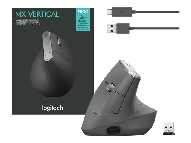 Vertikal mus - ergonomisk - optisk - 6 knappar - trådlös, kabelansluten - Bluetooth, 2.4 GHz - trådlös USB-mottagare - grafit