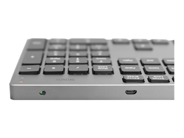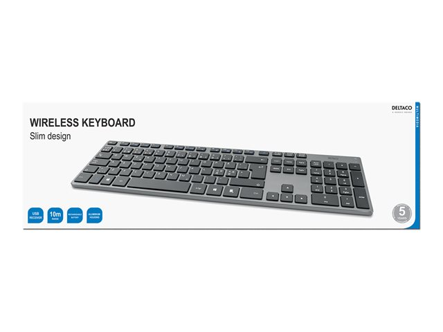 Trådlöst slimmat tangentbord i rymdgrå aluminiumfinish. Detta tangentbord fungerar i upp till 120 timmars kontinuerligt arbete när det är fulladdat. Trådlös mus med optisk sensor och tysta klickar samt skroll. Musen är en sån kallad Silent mouse, och har nästintill ljudlös vänster och högerklick. Förutom den minskade ljudnivån ger musen en mycket behagligare känsla vid användning. Musen är utrustad med ett uppladdningsbart batteri på 600 mAh som gör det smidigt att ladda vid behov. Den är även utrustad med en avstäningsbar LED batteriindikator för att se när batteriet börjar ta slut. Tycker man att LED ljuset är störigt kan man stänga av det på knappen på undersidan av musen.