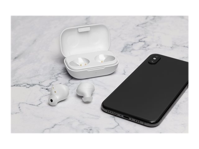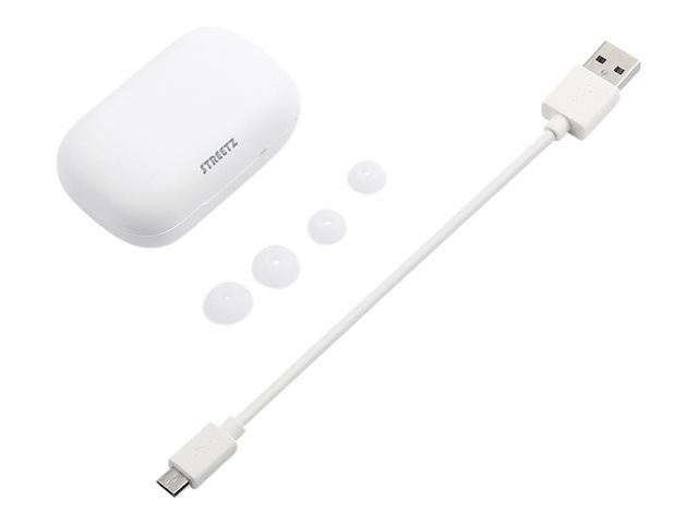 Trådlösa TWS hörlurar från STREETZ med mikrofon, samtal/mediaknappar, Bluetooth 5 med 10 m räckvidd och en ergonomisk passform för bekvämt lyssnande i upp till 16 timmar med det medföljande laddningsetuiet.