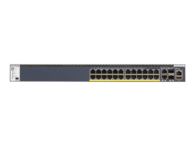 - The M4300-28G-PoE+ provides 24 Gigabit PoE+ ports with 2 10GBASE-T and 2 10GBASE-X SFP+ uplink connectivity