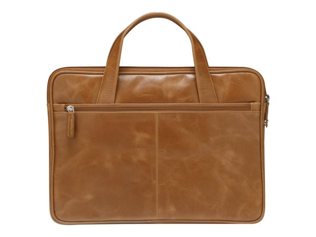 - Golden tan leather case with handles and strap